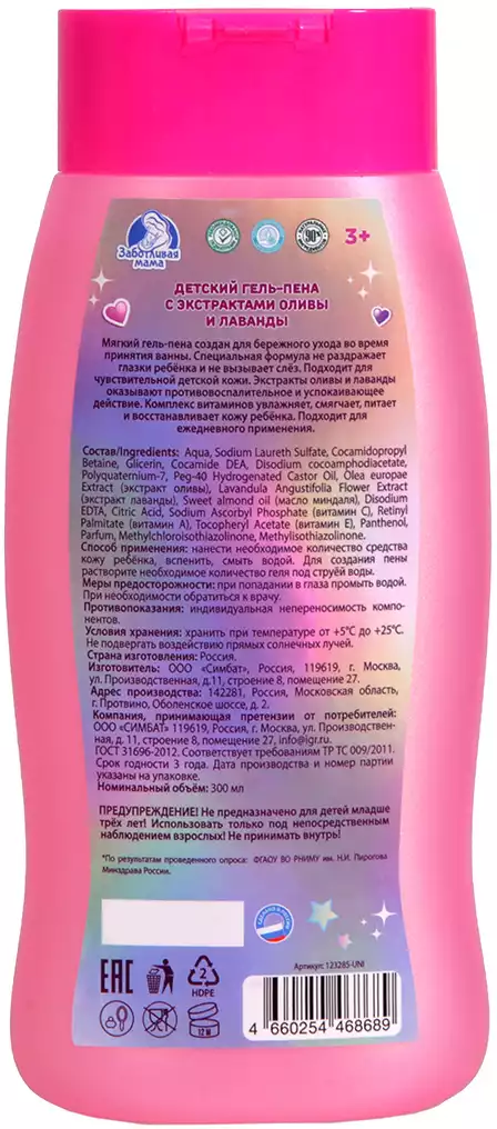 Экстракт оливы питает и увлажняет кожу. Экстракт лаванды расслабляет ребёнка перед сном.